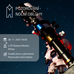 Další astronomické pozorování noční oblohy se bude konatv pátek 28. 11. v 19:00 u ZŠ Otokara Březiny. Za hezkého počasí se sejdeme na plácku vedle skleníku, konkrétně zde, a vlastníma očima i astronomickými dalekohledy se podíváme na to, co se nám každý den odehrává nad hlavou.