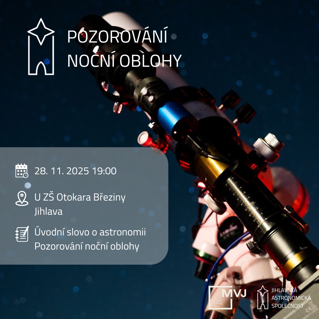 Zveme vás na další pozorování noční oblohy, které se tentokrát uskuteční v areálu Základní školy O. Březiny v Jihlavě – u skleníku, konkrétně zde.